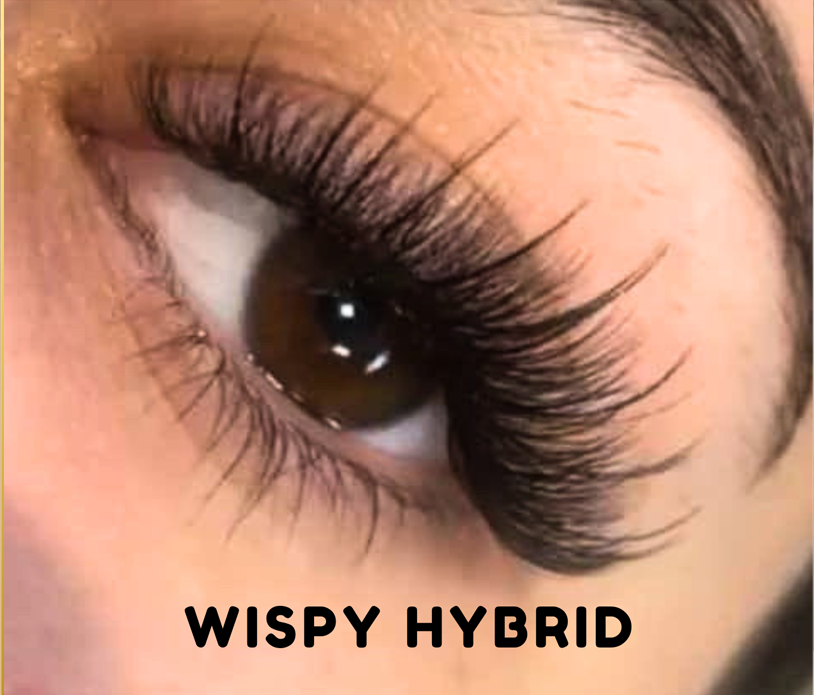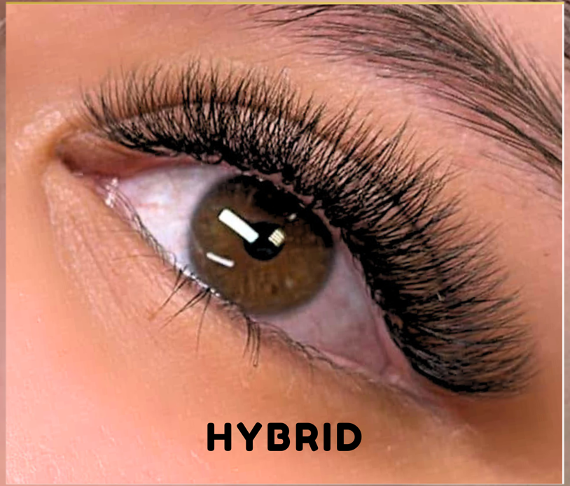 Hybrid lashes extensions are exactly how they sound. A combination of classic and volume lash extensions across your lash line which are giving you volume and length, resulting in a wispy, textured lash extension look.